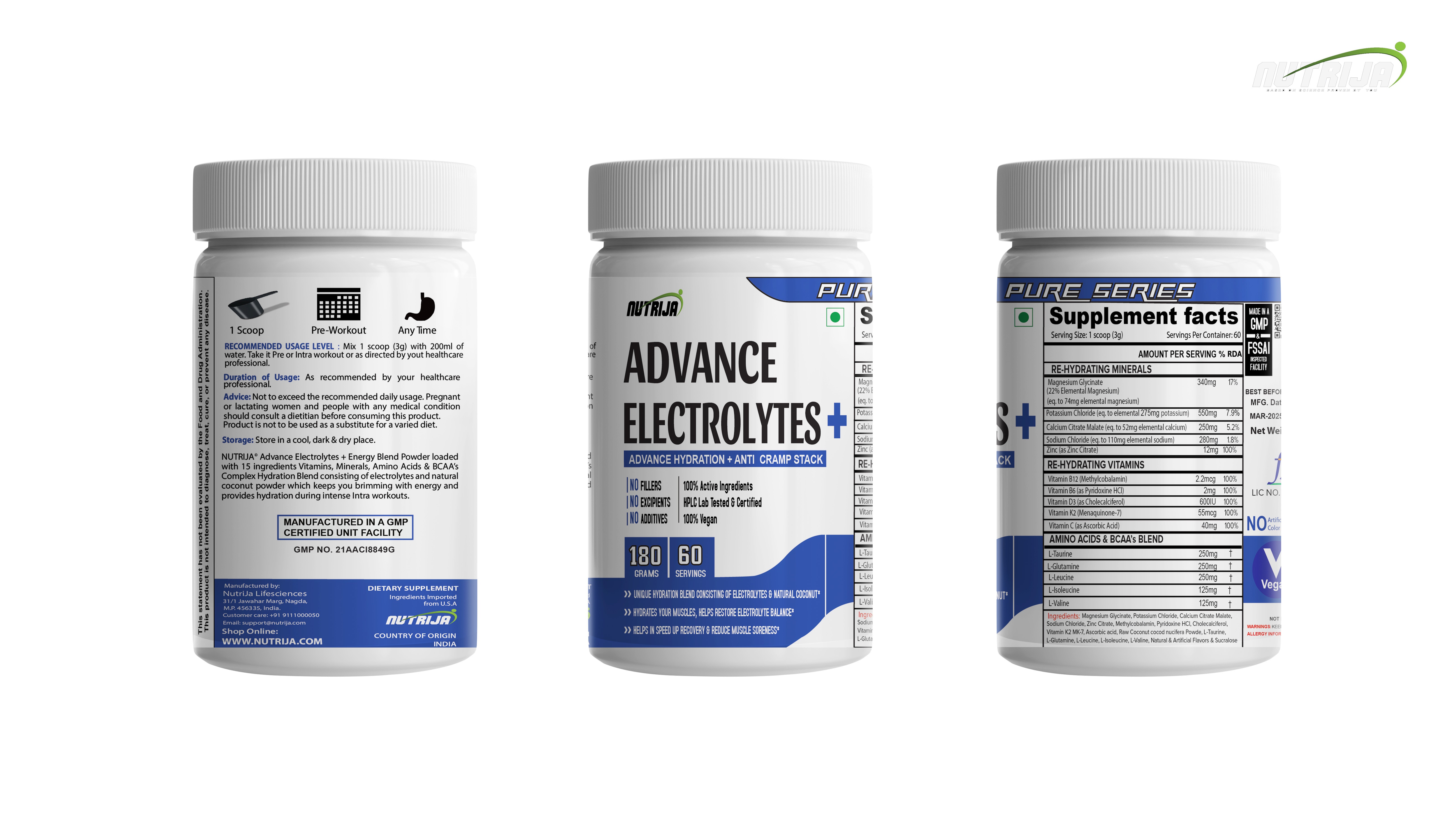 NUTRIJA® Advance Electrolytes + Energy Blend Powder loaded with 15 ingredients Vitamins, Minerals, Amino Acids & BCAA’s Complex Hydration Blend consisting of electrolytes and natural coconut powder which keeps you brimming with energy and provides hydration during intense Intra workouts.