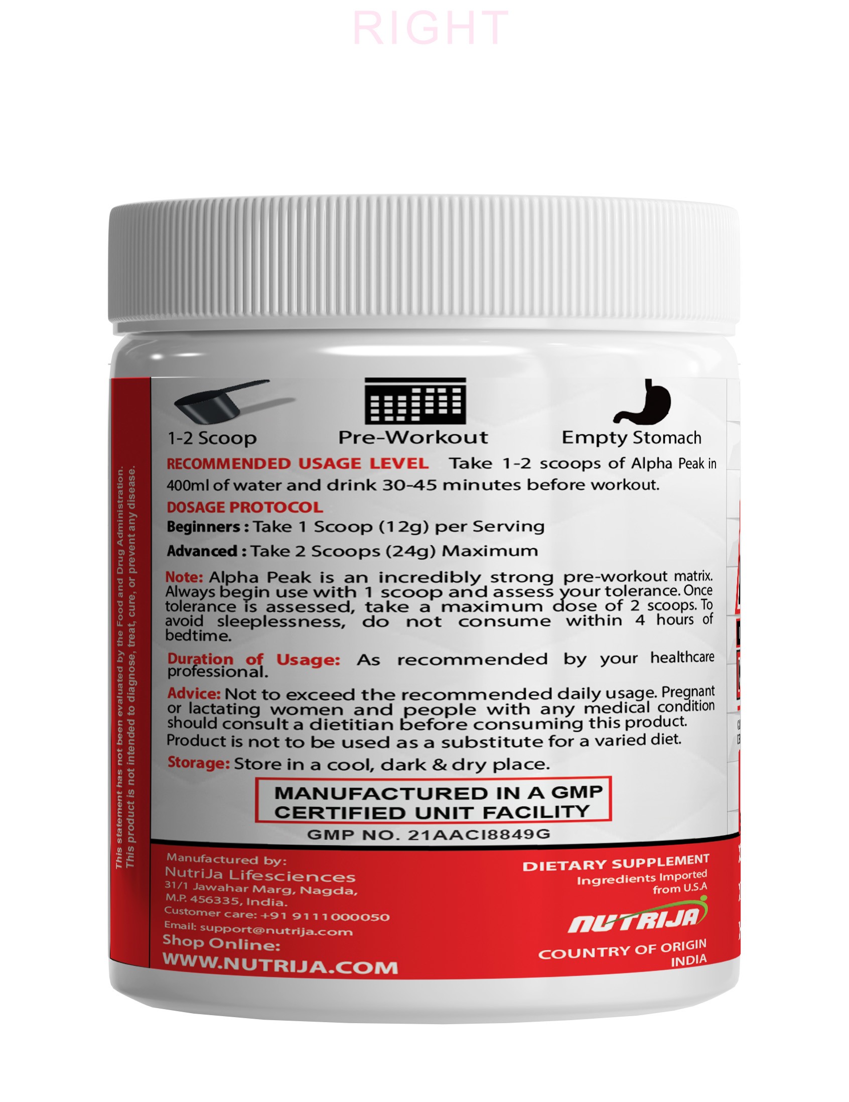 Alpha Peak is an incredibly strong pre-workout matrix. Always begin use with 1 scoop and assess your tolerance. Once tolerance is assessed, take a maximum dose of 2 scoops. To avoid sleeplessness, do not consume within 4 hours of bedtime.