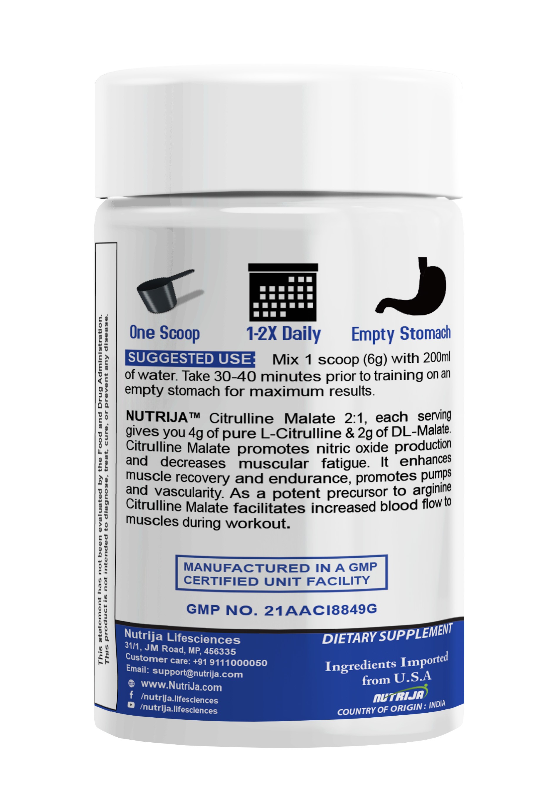 - Each 6g serving of NUTRIJA™ Citrulline Malate 2:1 gives you 4g of pure L-Citrulline & 2g of DL-Malate