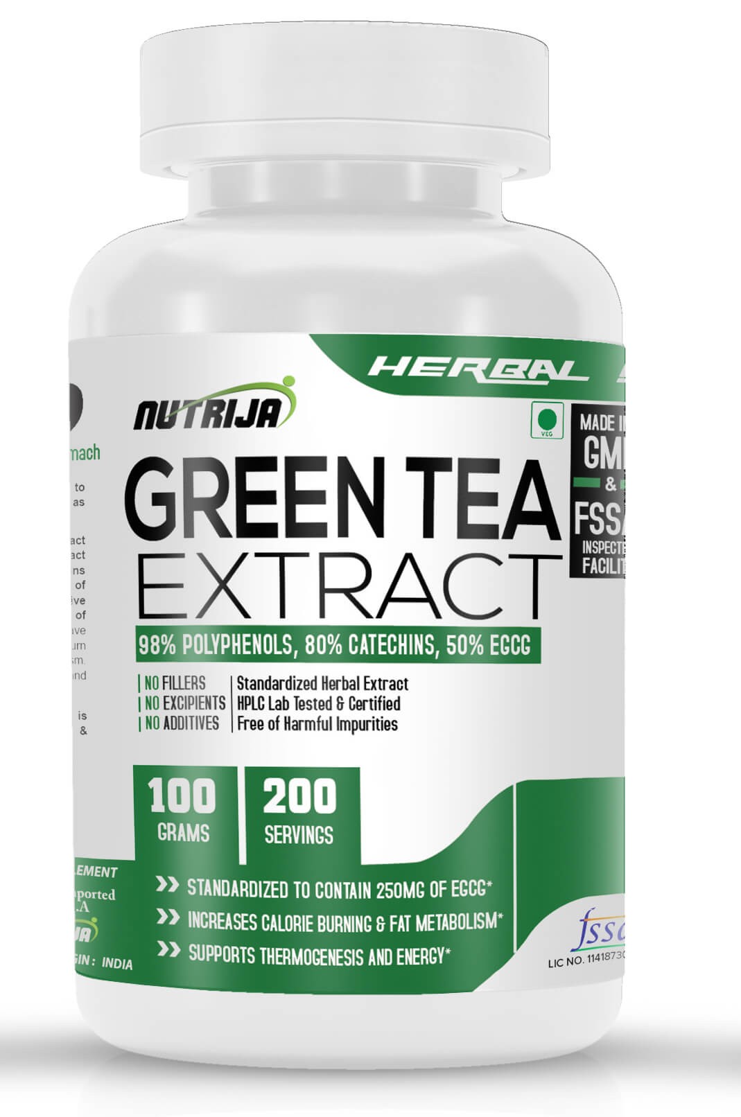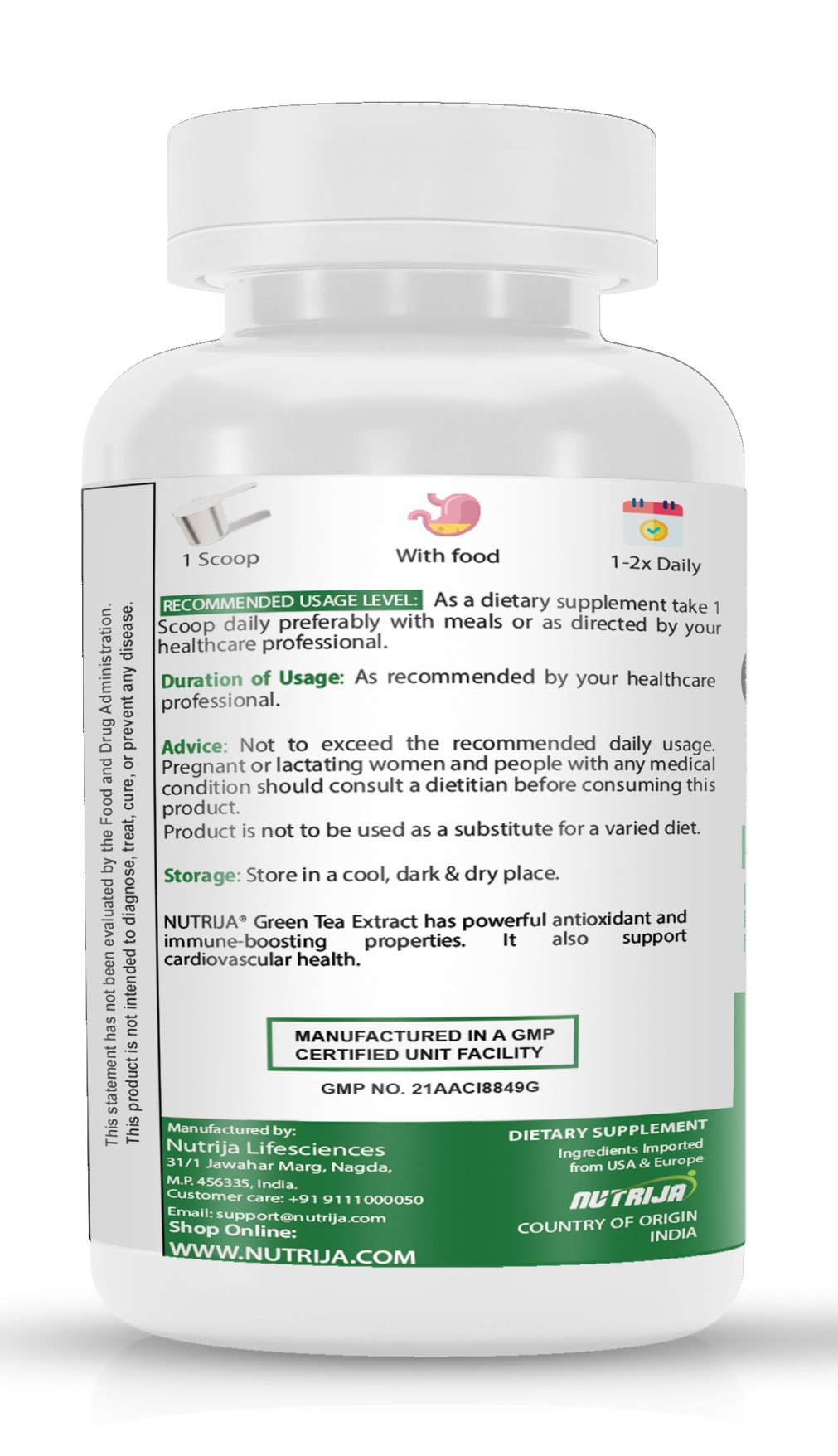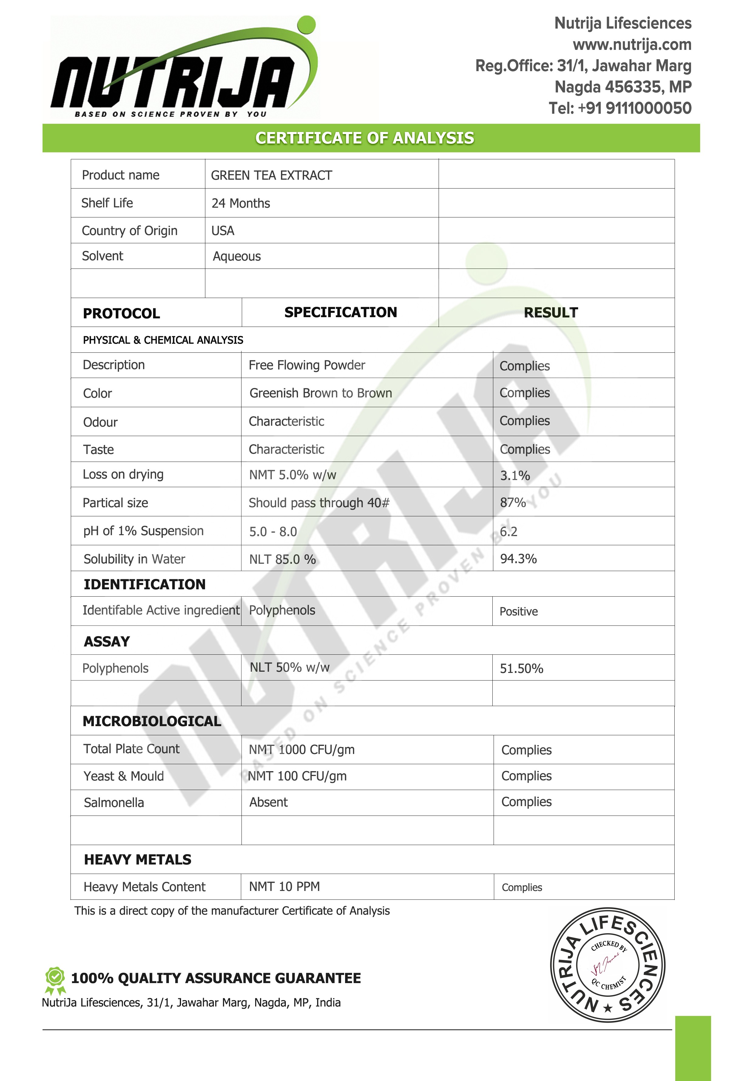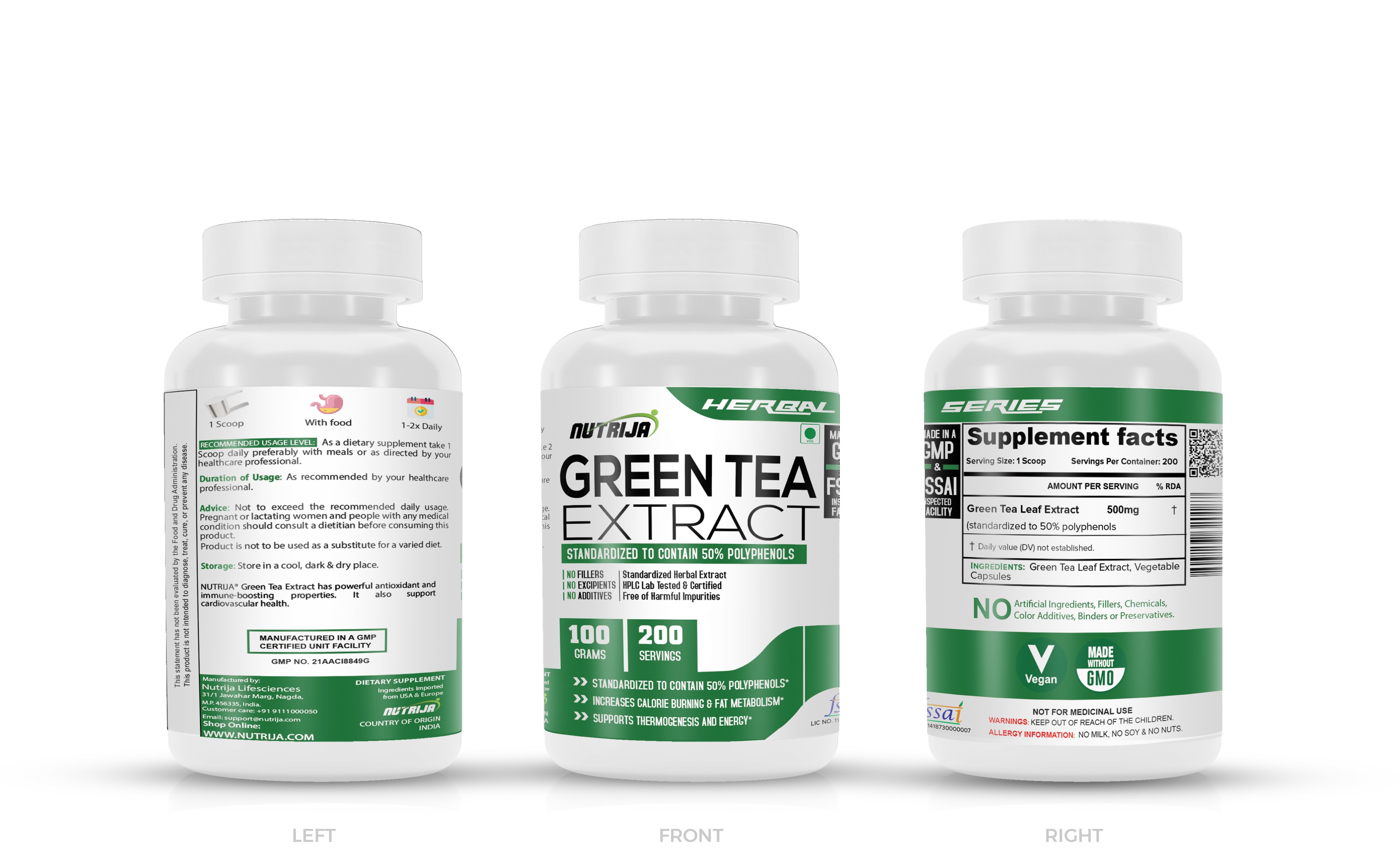 NUTRIJA™ Green Tea Extract is standardized to 50% Polyphenols. We source Green Tea Extract in India from USA based reputed GMP certified facility and are tested in-house as well as by third-party labs to ensure purity and potency of Green Tea Extract. See "Certificate Of Analysis" at the top right.