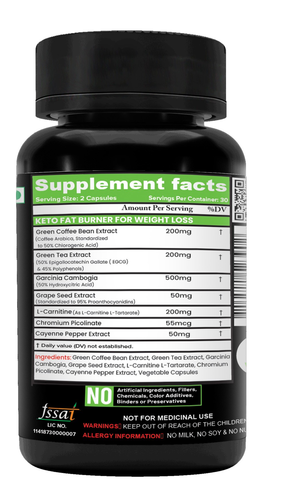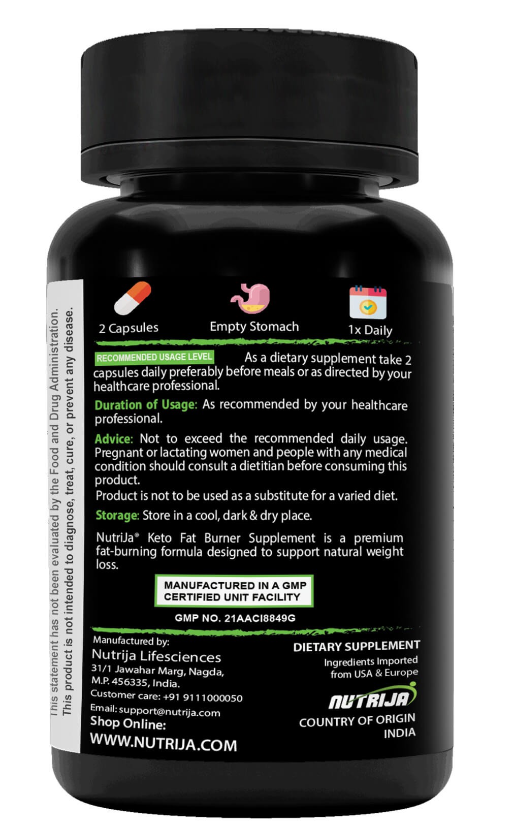 NutriJa® Keto Fat Burner Supplement is a premium fat-burning formula designed to support natural weight management & ketosis. This supplement contains a powerful blend of Green Coffee, Green Tea, Garcinia Cambogia, L-Carnitine, Cayenne Pepper Extract & Chromium, known for their metabolism-boosting & fat-burning properties