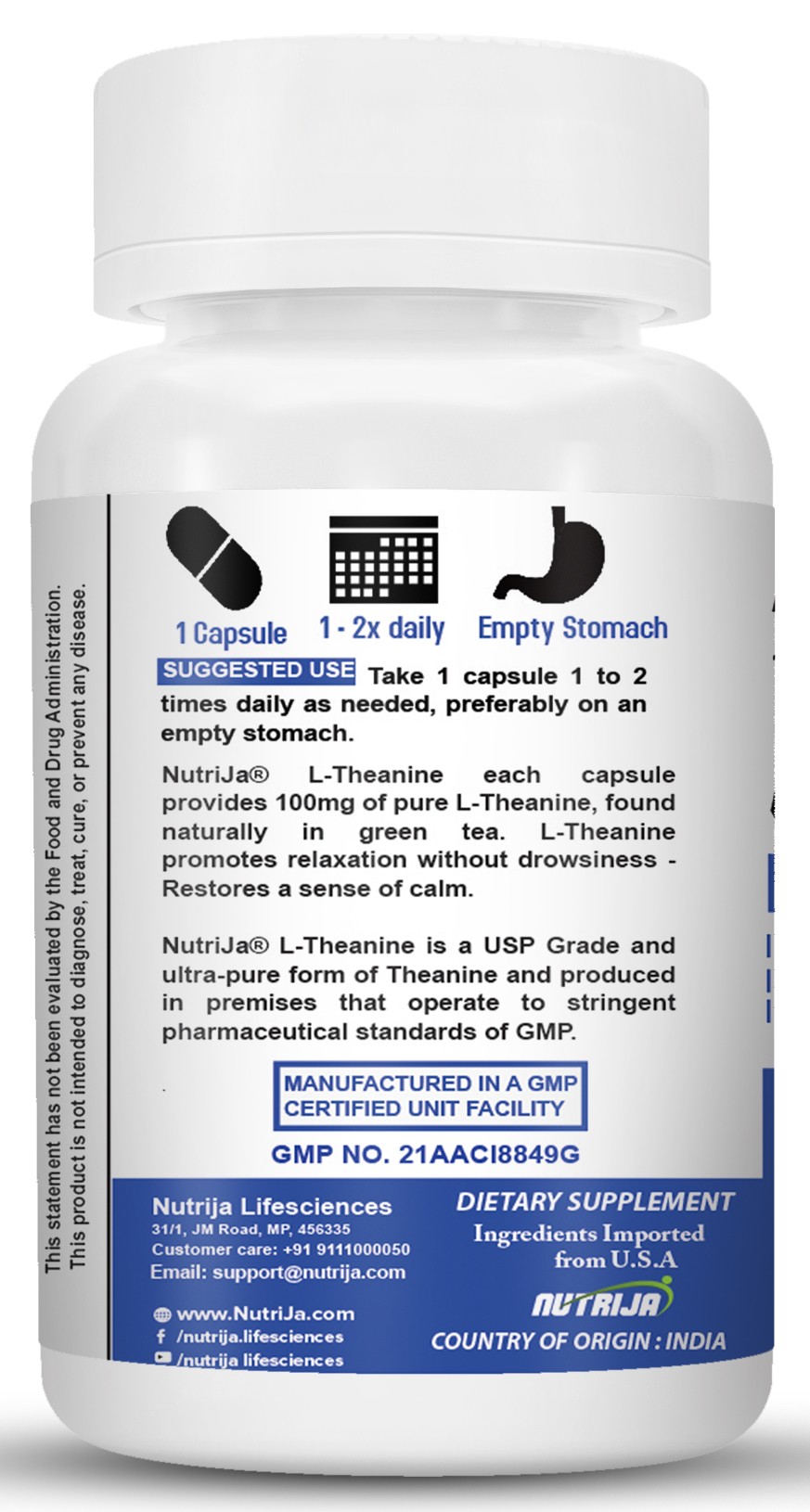 NUTRIJA™ L-Theanine is manufactured in USA based GMP certified facility in it’s purest form and derived from vegetarian source. and well tested in lab for purity and potency. A quick glance at the Certificate of Analysis (COA) on this product page (to the side of the product image) details the high levels of purity.