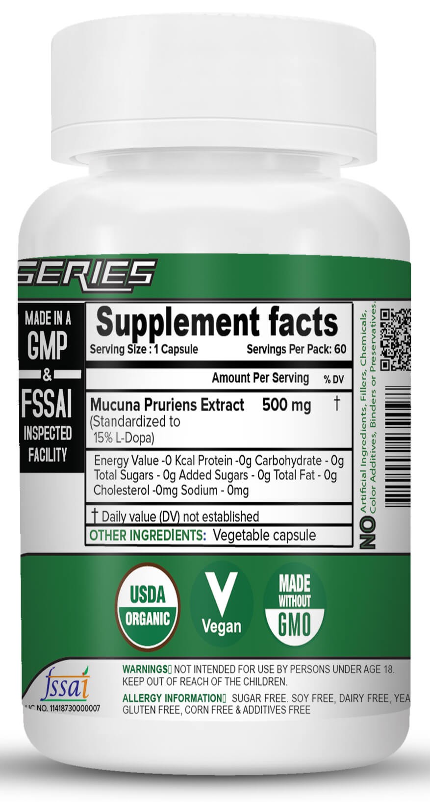 - Each capsule provides 500mg of Mucuna Pruriens Extract, Standardized to 15%L-Dopa