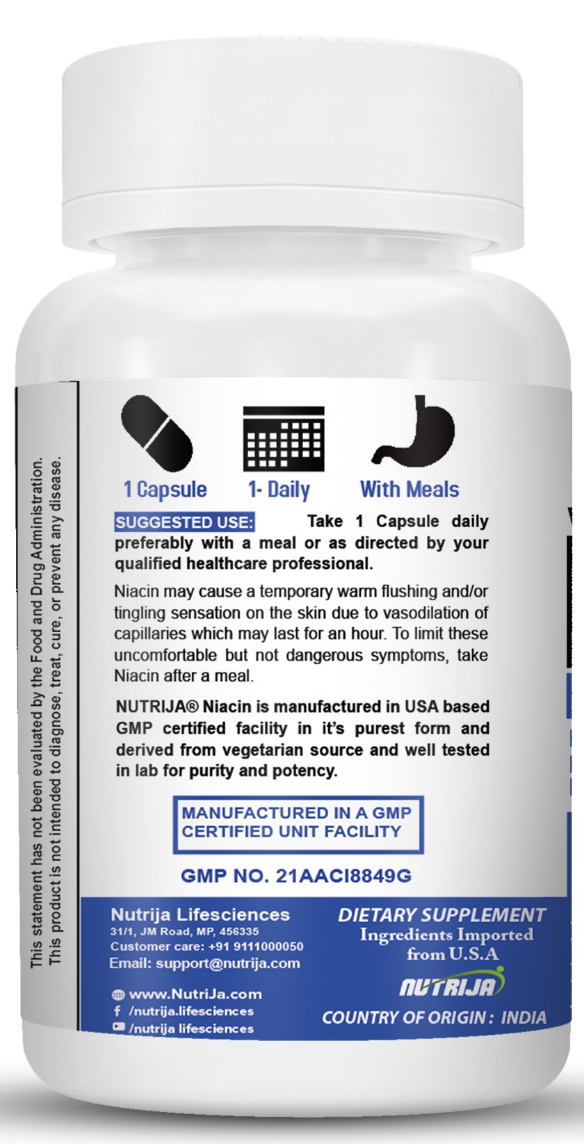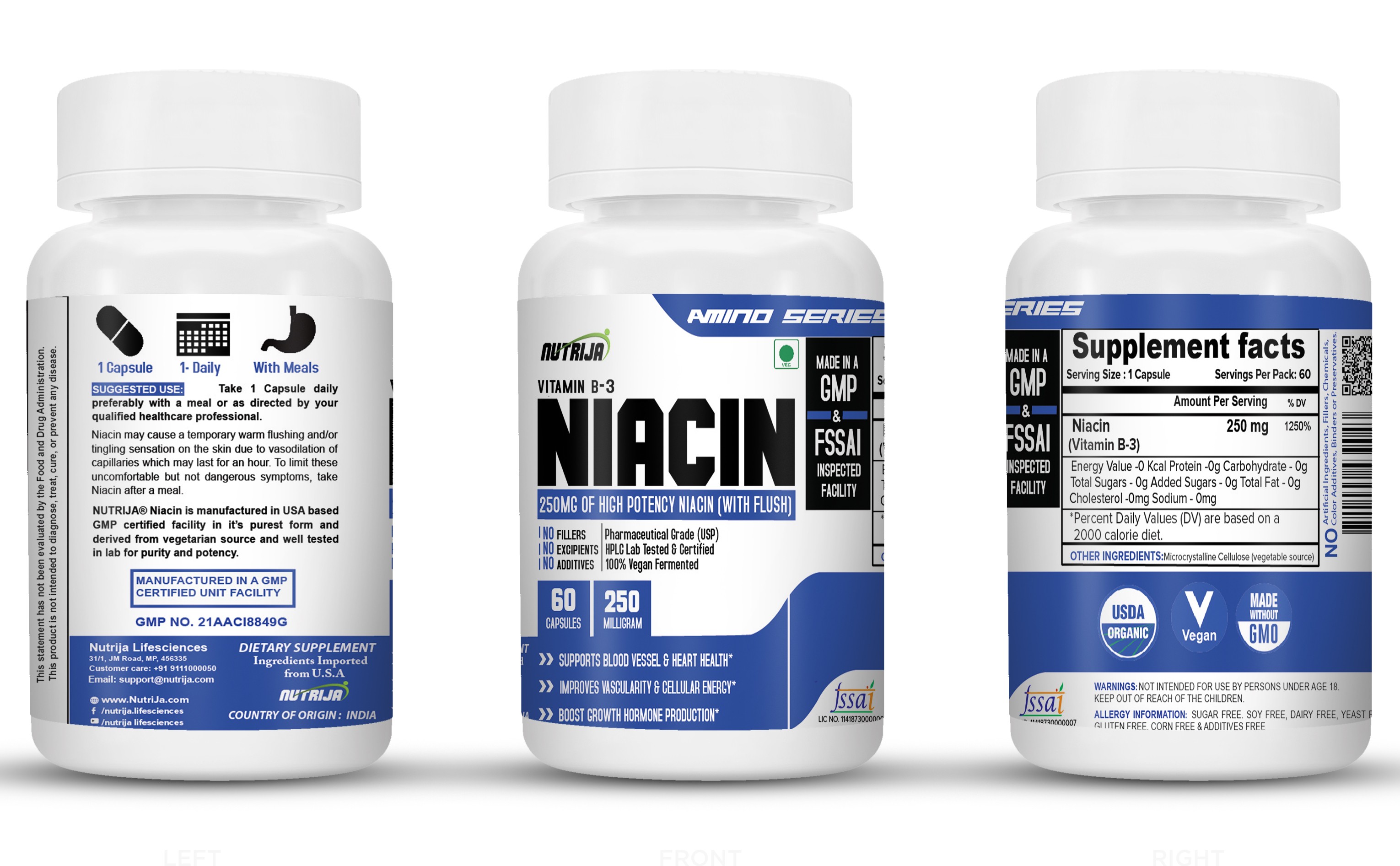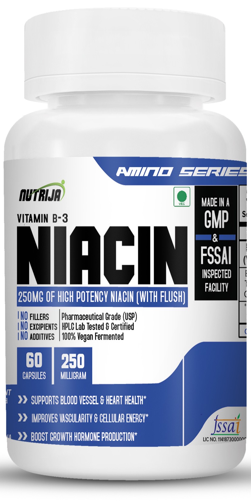 NUTRIJA® Niacin (Vitamin B-3) each capsule provides 250mg of pure Niacin (Nicotinic acid) in Pharmaceutical & USP Grade Quality. Niacin is an essential B-Vitamin (B-3) is required for the metabolism of carbohydrates and protein into energy.