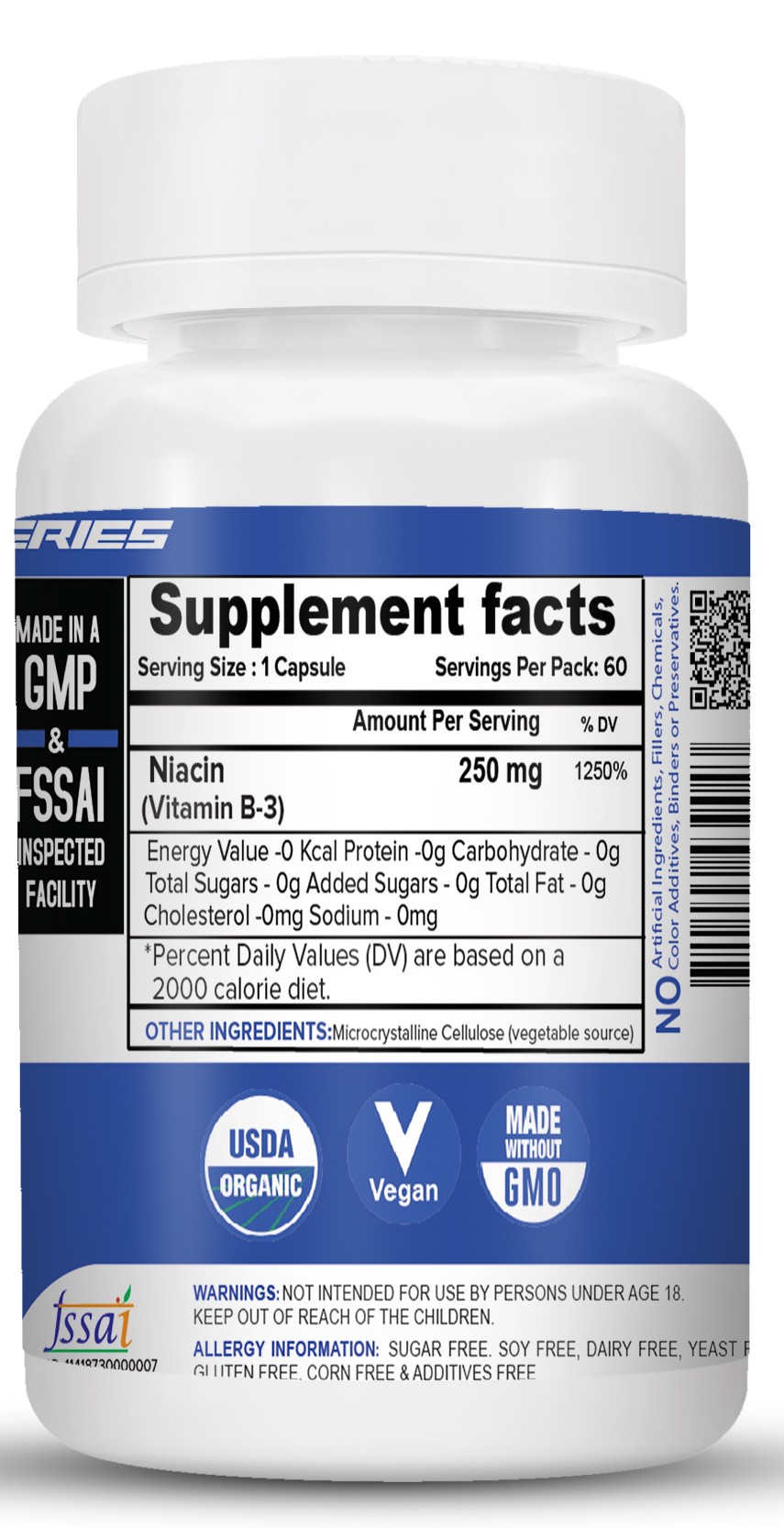 - 250mg Of High Potency Niacin (Vitamin B-3) Per Capsule