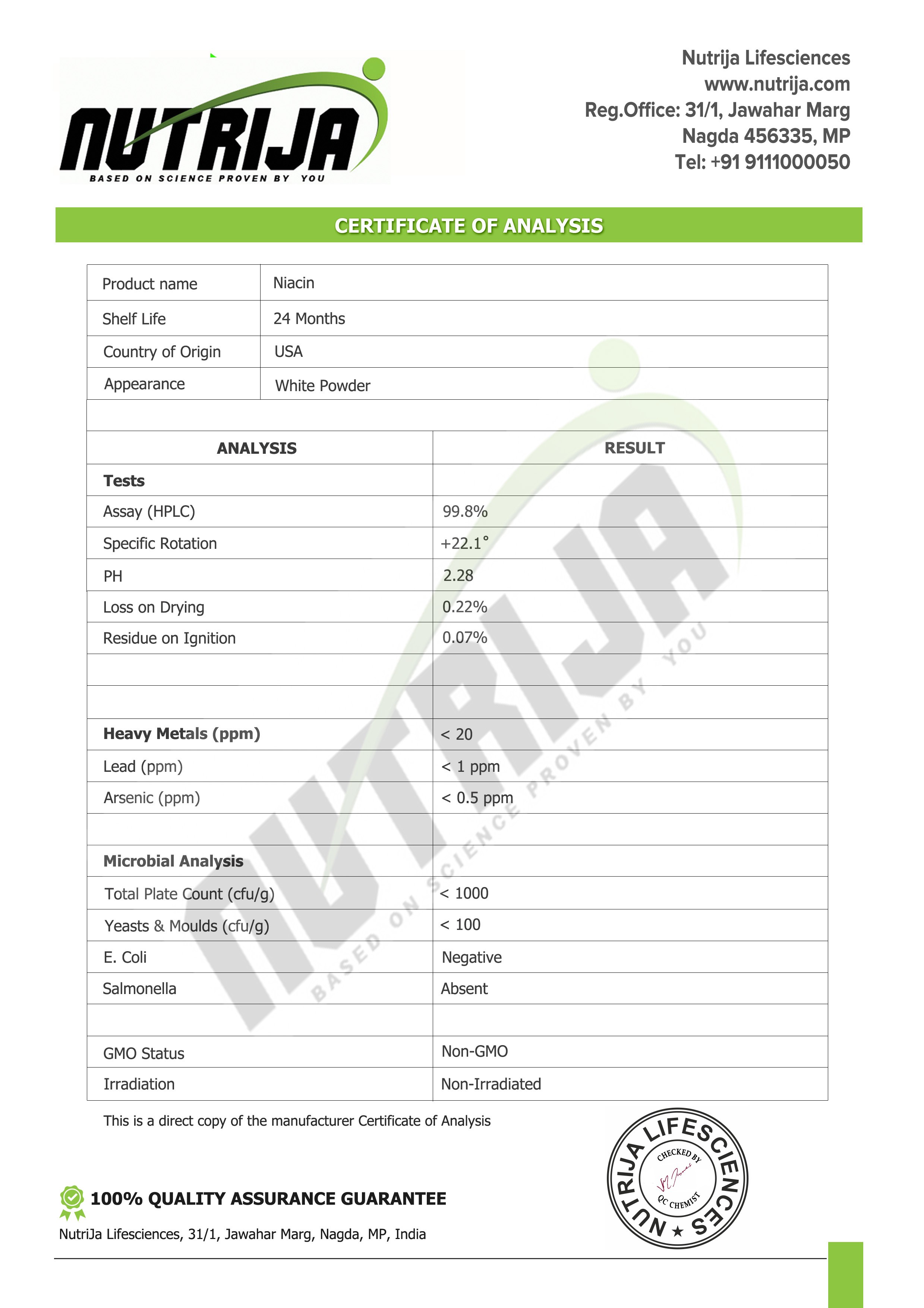 NUTRIJA® Niacin (Vitamin B-3) is manufactured in USA based GMP certified facility in it’s purest form and derived from vegetarian source and well tested in lab for purity and potency. A quick glance at the Certificate of Analysis (COA) on this product page (to the side of the product image) details the high levels of purity.