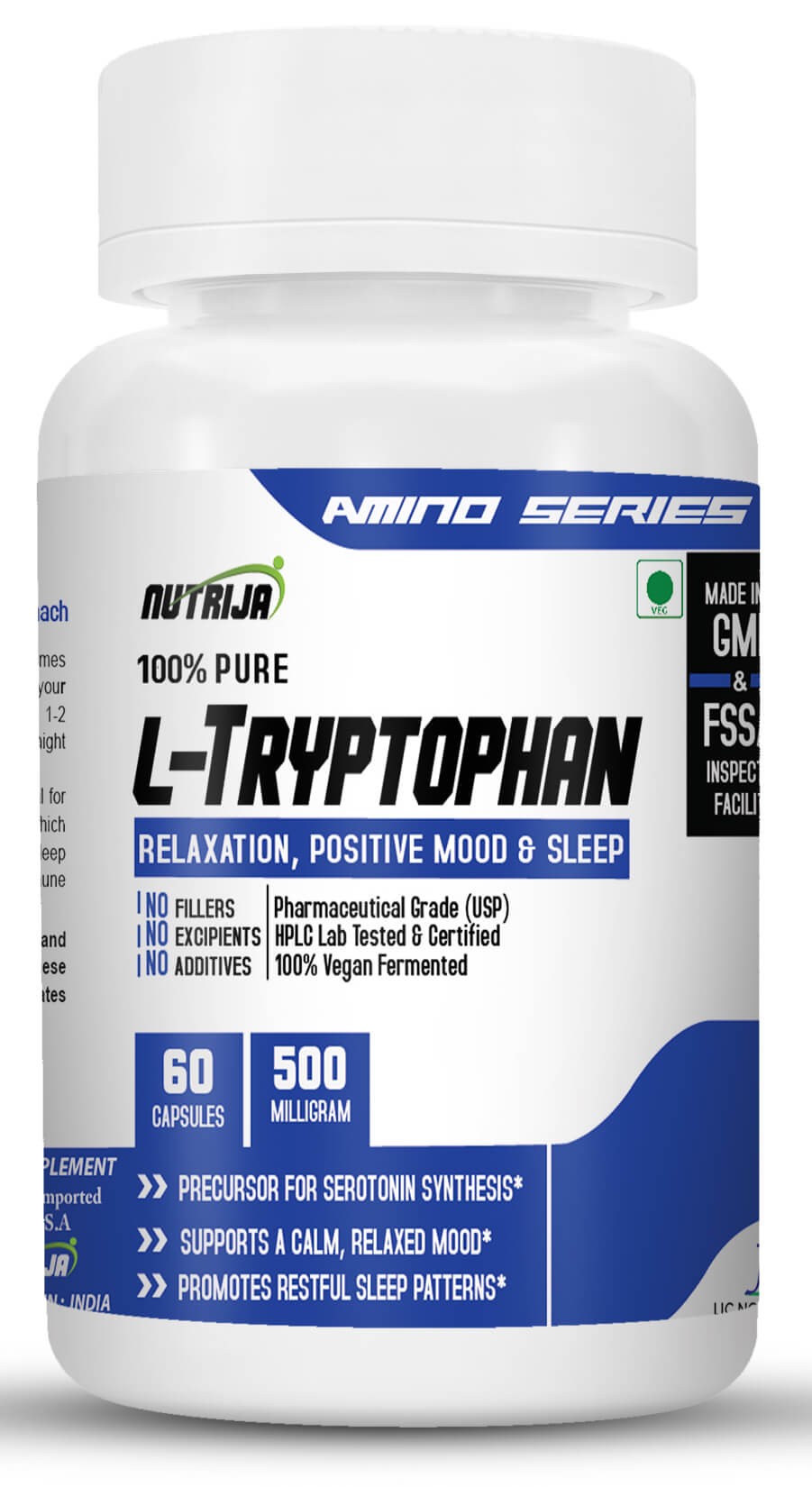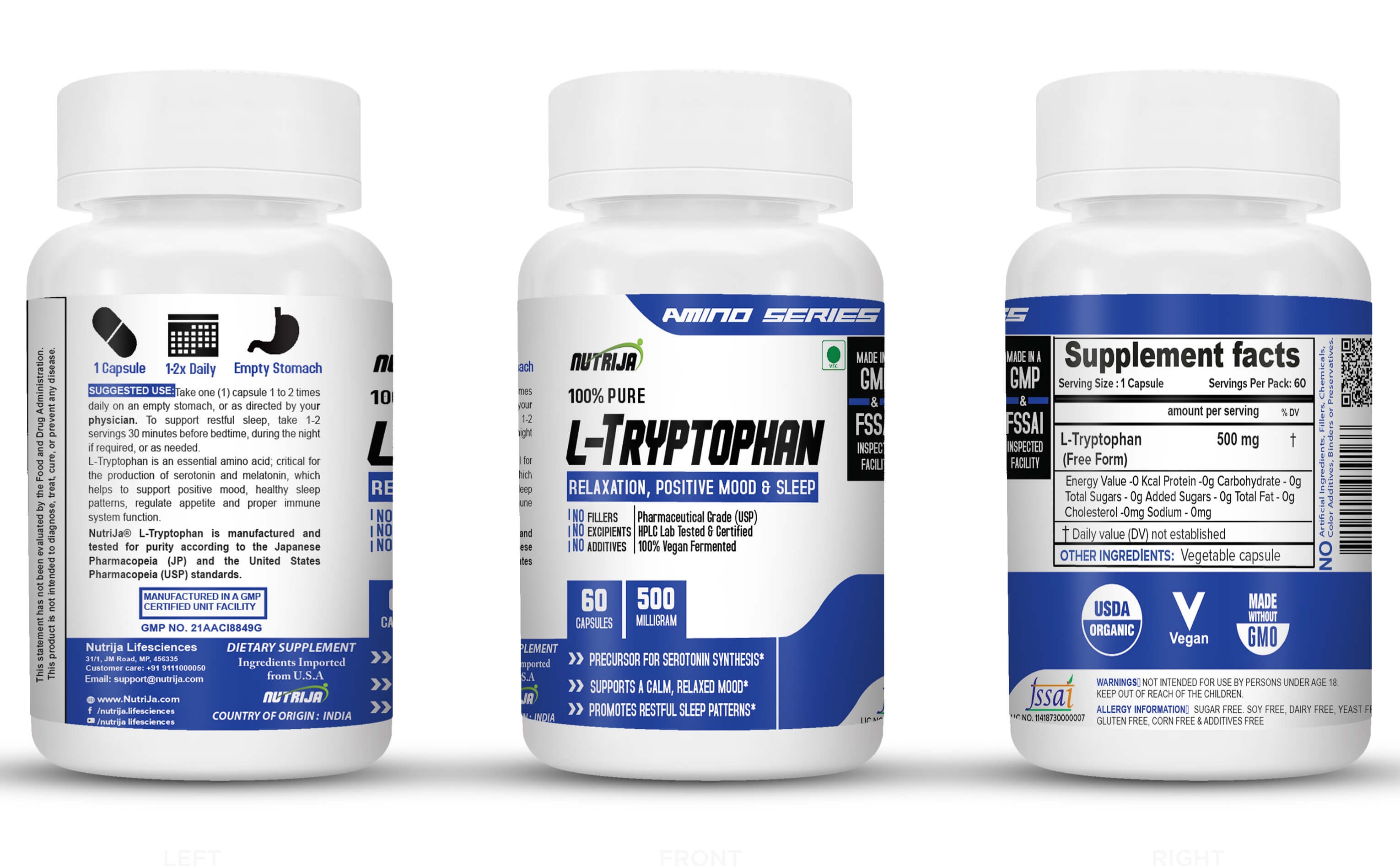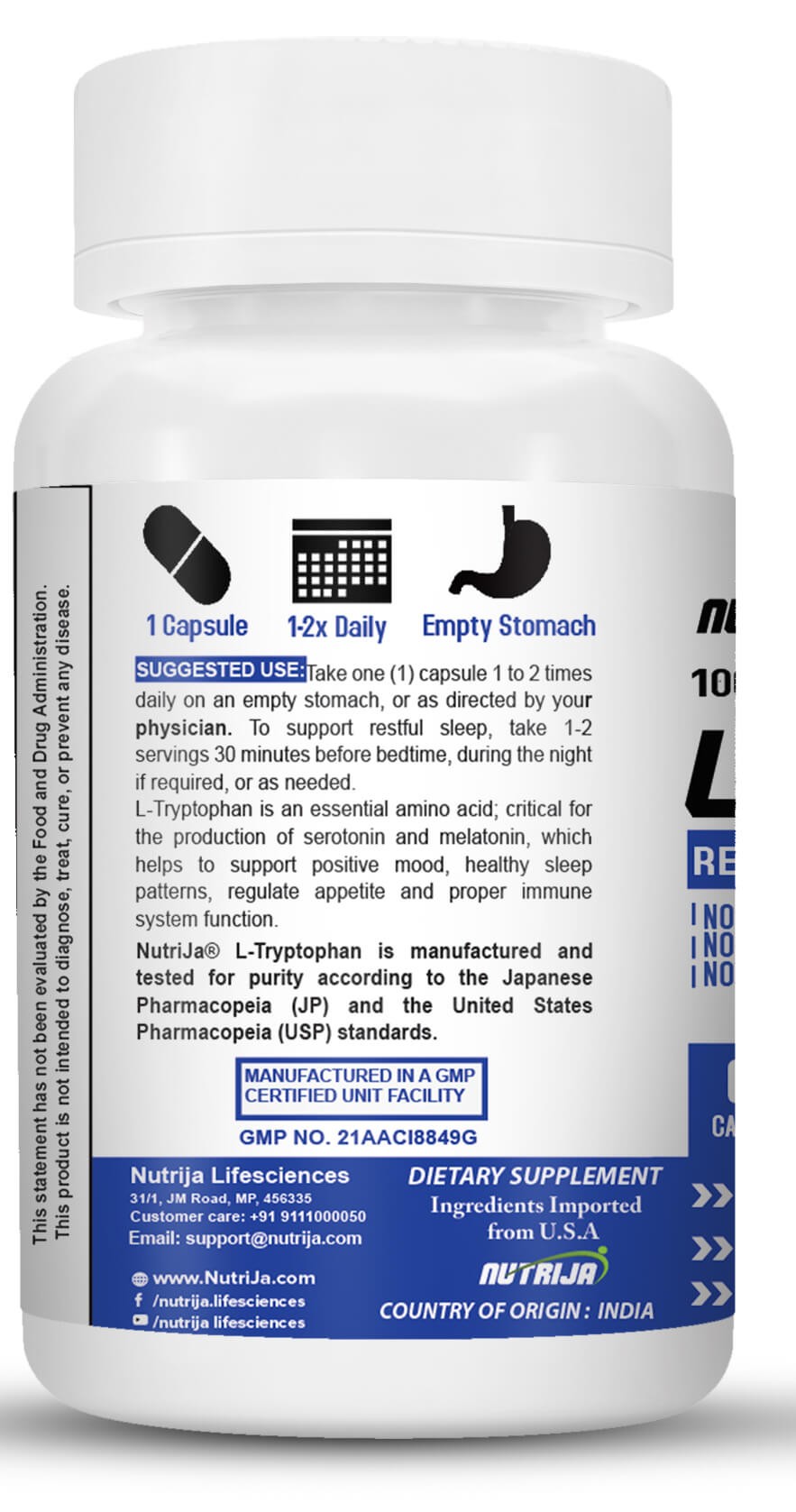 NutriJa™ Tryptophan each veg capsule provides 500mg of L-Tryptophan (USP Grade & pharmaceutical quality amino acid) in a highly absorbable free-form, L-Tryptophan is an essential amino acid; critical for the production of serotonin and melatonin, which helps to support positive mood, healthy sleep patterns, regulate appetite and proper immune system function.