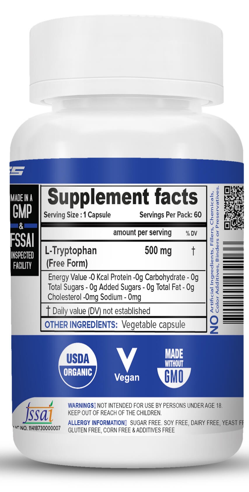 - 500mg of Pure Tryptophan (USP grade) per Capsule.