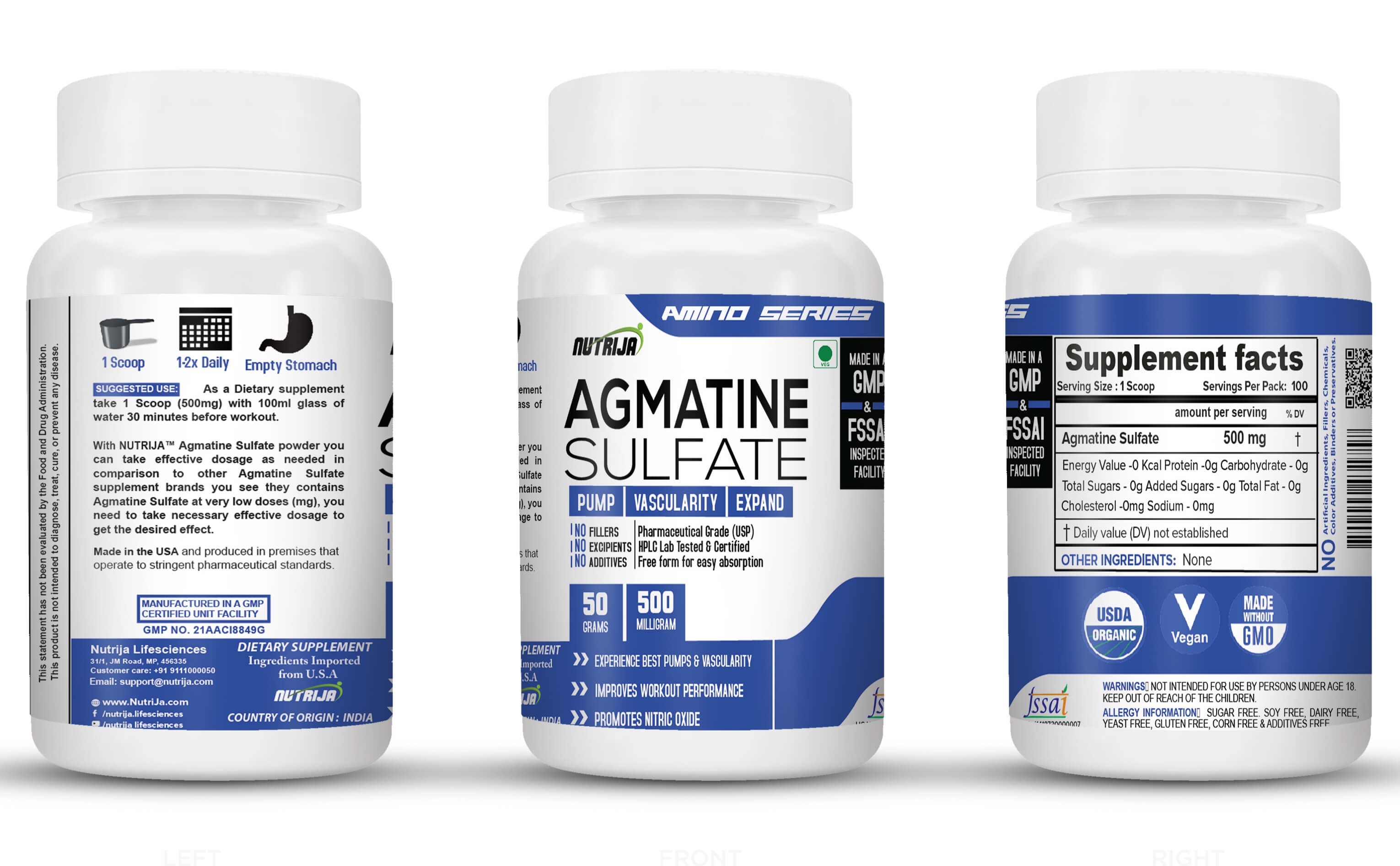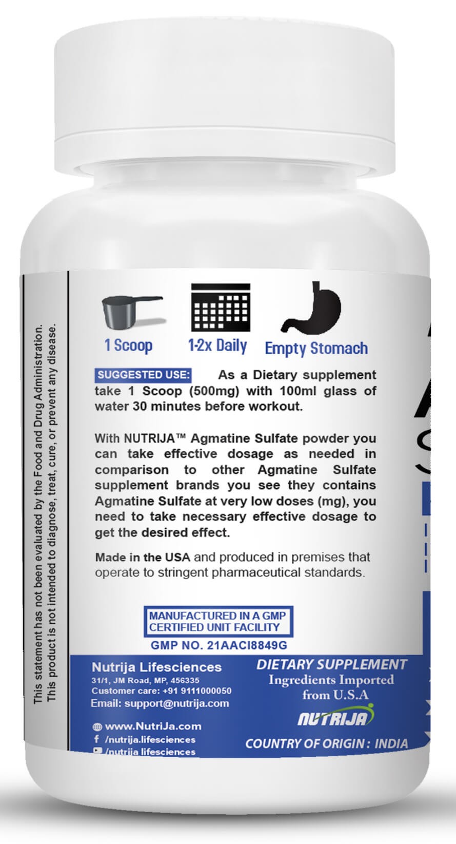 With NUTRIJA™ Agmatine Sulfate powder you can take effective dosage as needed in comparison to other Agmatine Sulfate supplement brands you see they contains Agmatine Sulfate at very low doses (mg), you need to take necessary effective dosage to get the desired effect.