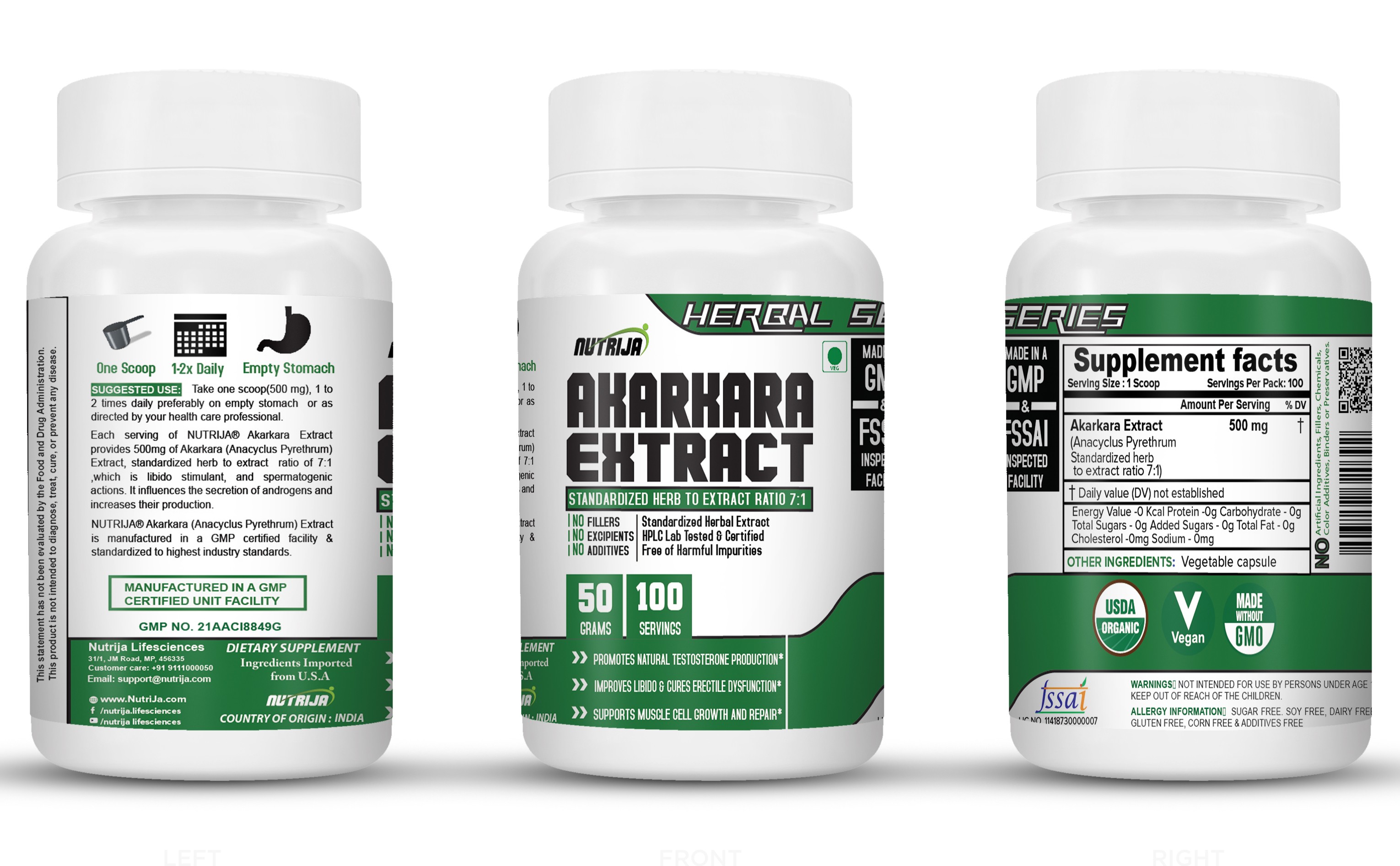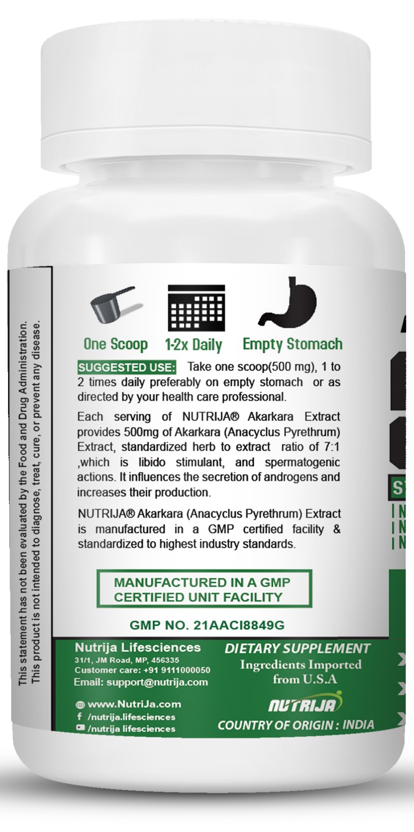 NUTRIJA™ Anacyclus Pyrethrum Extract (Akarkara) is standardized for Herb to Extract Ratio 7:1 in contrast to some brands you will find just raw Anacyclus Pyrethrum root powder. We source Anacyclus Pyrethrum Extract in India from reputed GMP certified facility and are tested in-house as well as by third-party labs to ensure purity and potency of Anacyclus Pyrethrum Extract. See "Certificate Of Analysis" at the top right.