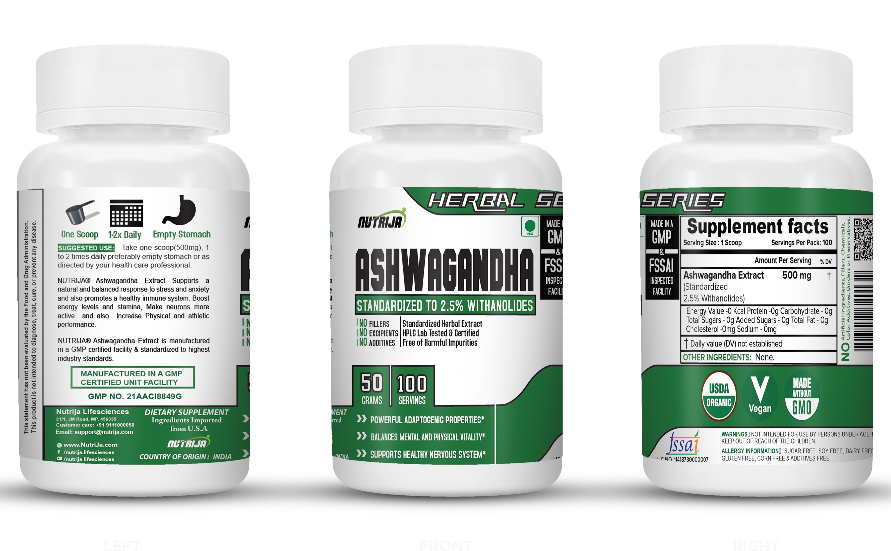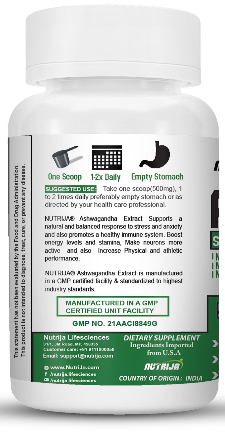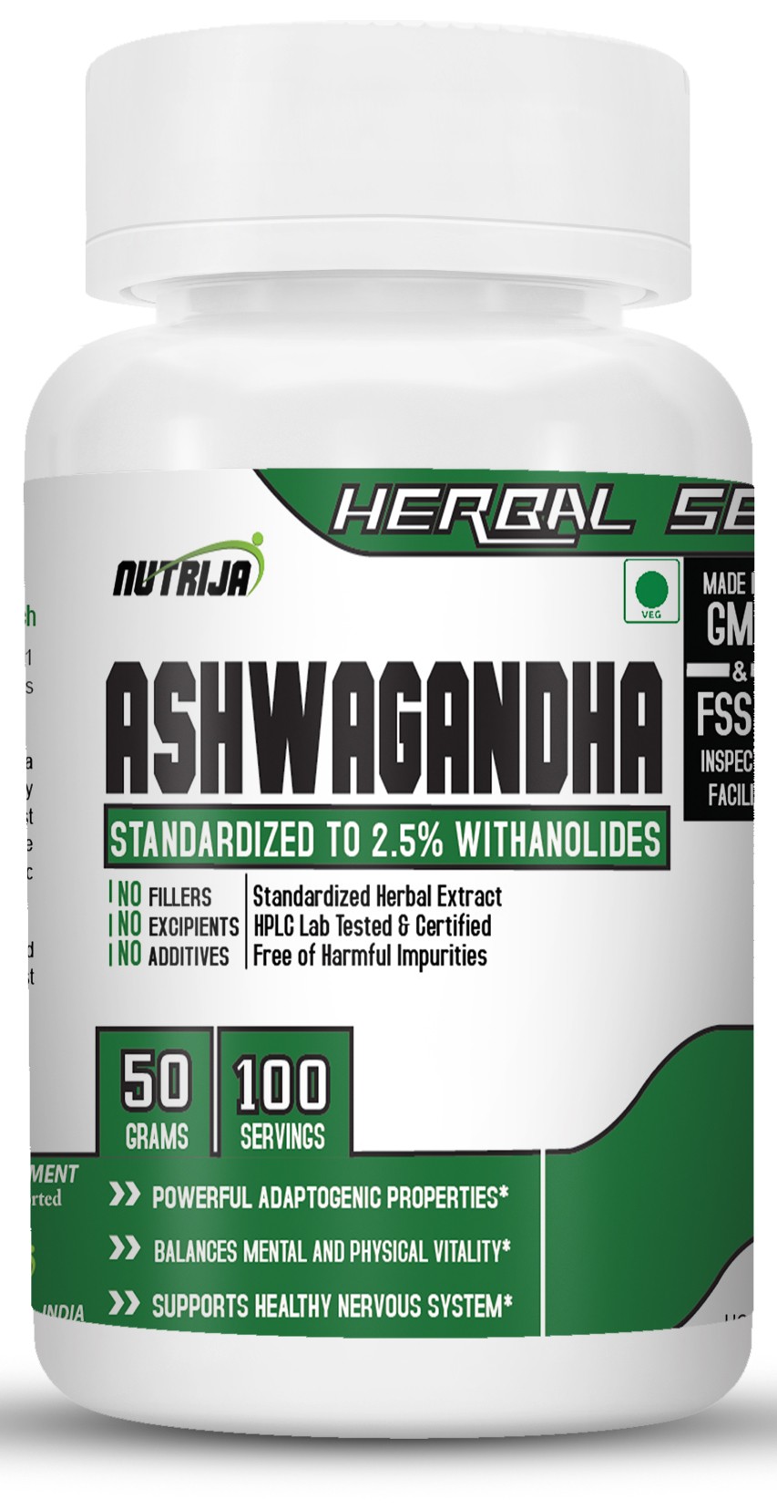 NUTRIJA™ Ashwagandha Root Extract is standardized to Withanoloids 2.5% in contrast to some brands you will find just raw Ashwagandha root powder. We source Ashwagandha Root Extract in India from reputed GMP certified facility and are tested in-house as well as by third-party labs to ensure purity and potency of Ashwagandha Root Extract. See "Certificate Of Analysis" at the top right.