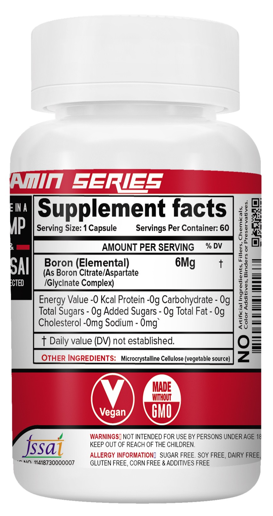 NUTRIJA™ Boron 6MG, provides 6Mg of Boron(elemental) as Boron Citrate/Aspartate/ Glycine Complex, which is necessary for healthy bone and joint Support. Boron is a trace mineral that plays a role in Calcium and Magnesium metabolism to promote bone health, by increasing absorption of Calcium and Magnesium upto 40%