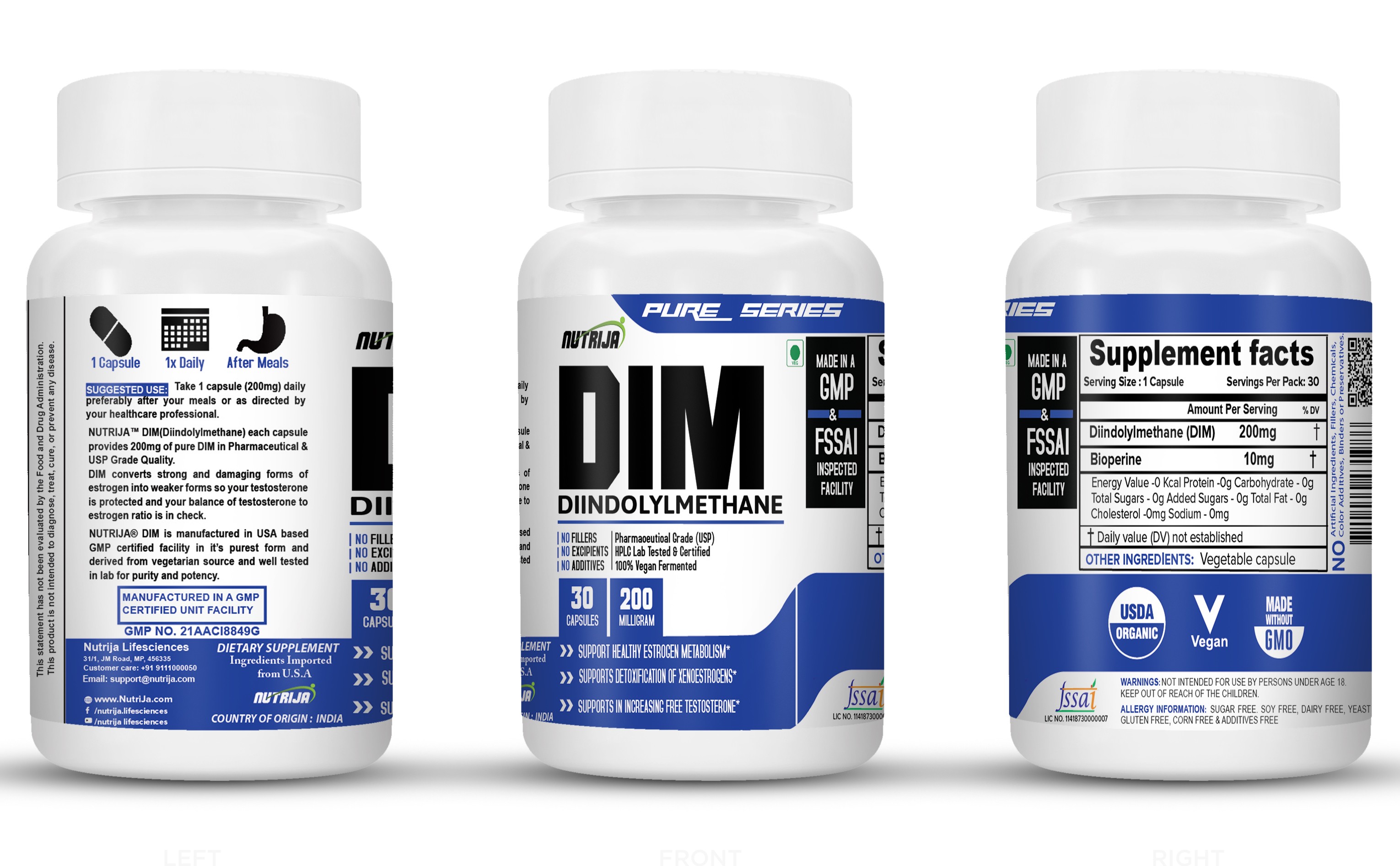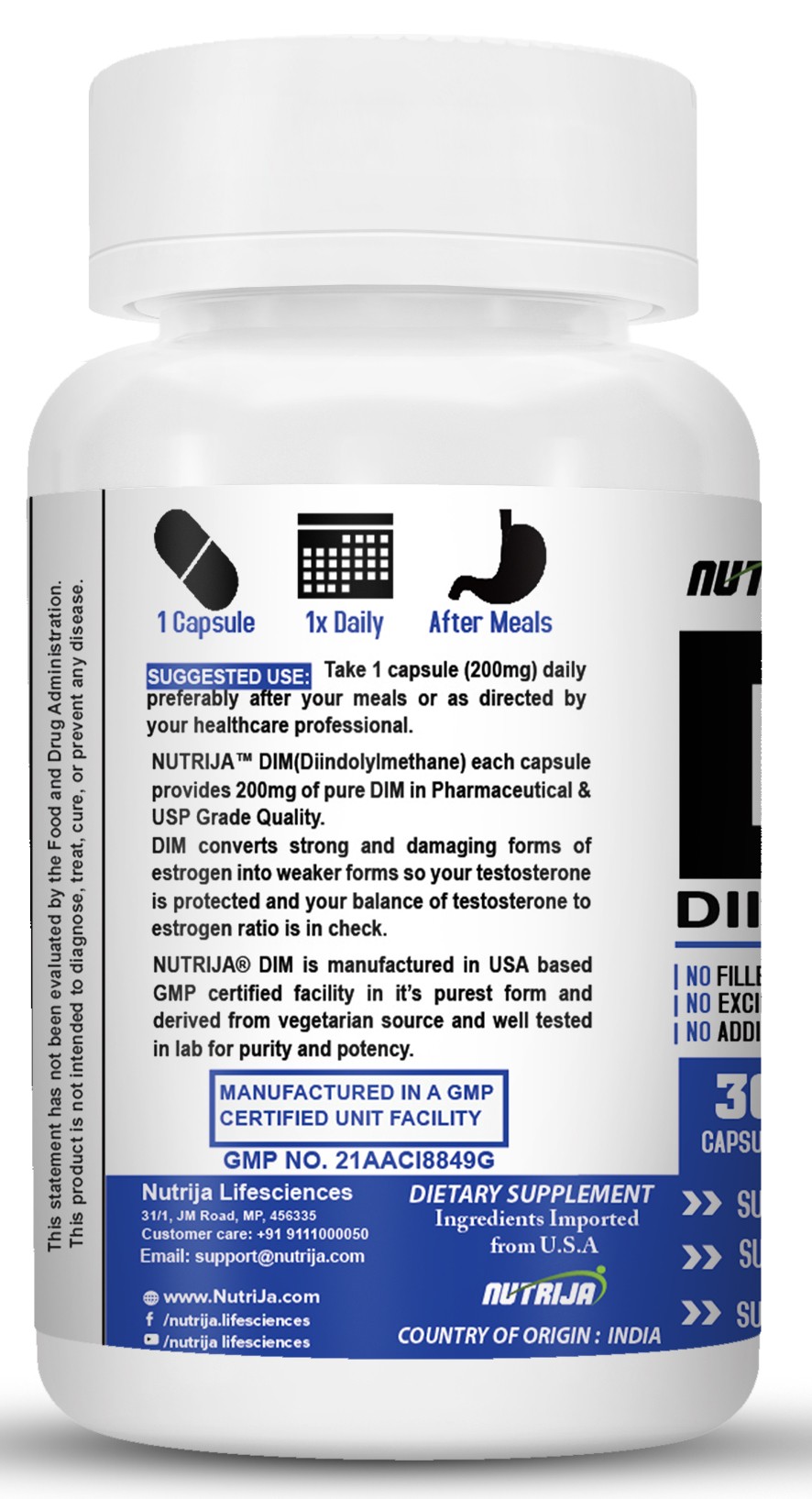 NUTRIJA™ DIM (Diindolylmethane) each capsule / pill provides 200mg of pure DIM (Diindolylmethane) (Pharmaceutical & USP Grade). Diindoylymethane (DIM) is a component of Indole-3-carbinol (I3C) found mainly in broccoli. NutriJa™ DIM converts strong and damaging forms of estrogen into weaker forms so your testosterone is protected and your balance of testosterone to estrogen ratio is in check.Dim Produces Estrogen Metabolites, Which Compete With Testosterone For Protein Binding, Helping To Maintain Higher Testosterone Level.