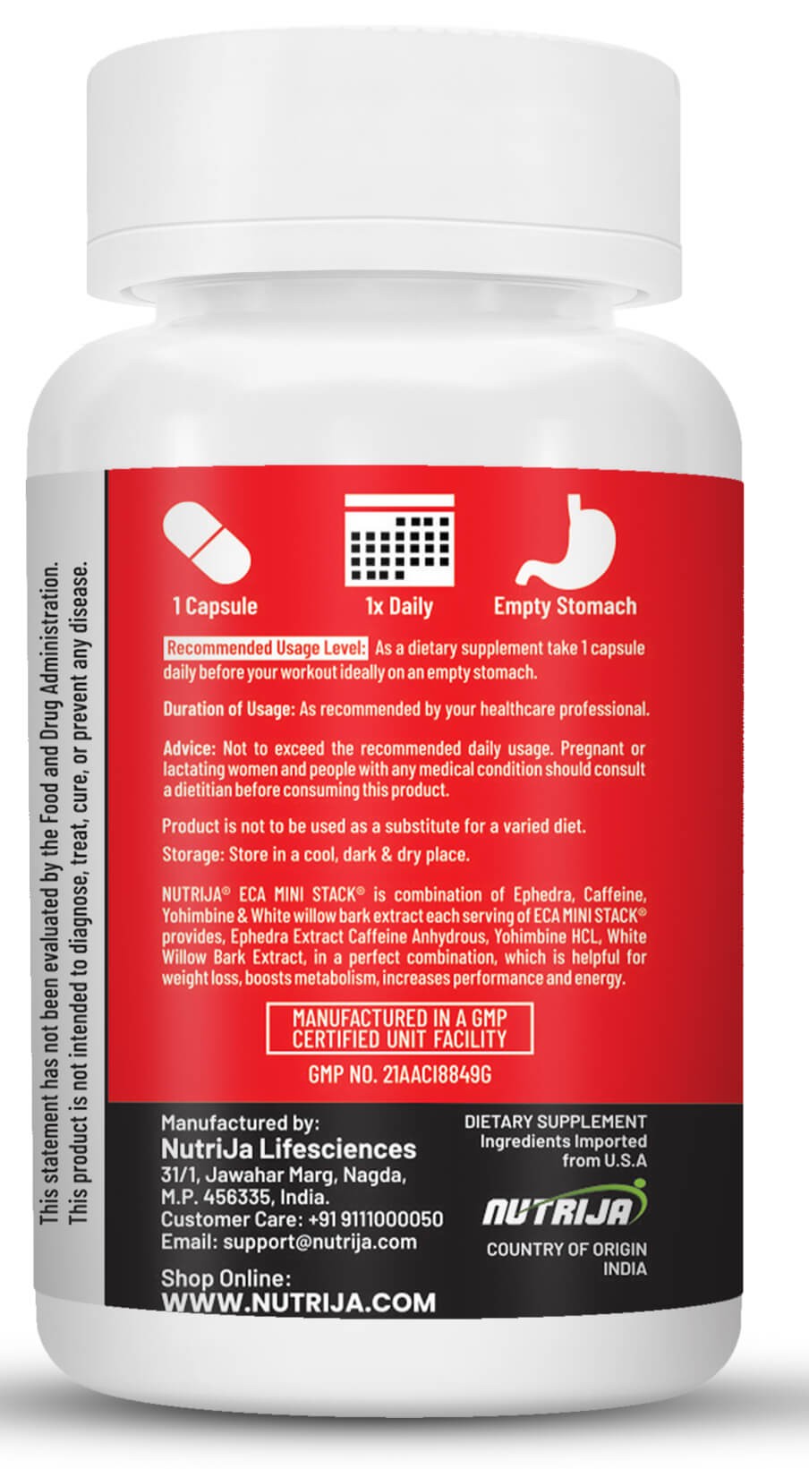 NUTRIJA ECA MINI STACK is combination of best and proven fat loss supplements, each serving of ECA MINI STACK provides, Ephedra Extract Caffeine Anhydrous, Yohimbine HCL, White Willow Bark Extract, in a perfect combination, which accelerates fat loss, boosts metabolism, increases performance and energy.