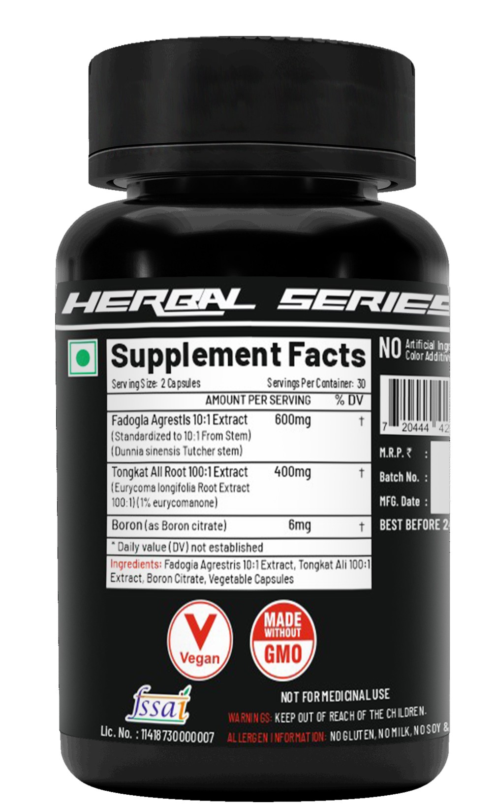 | Ingredients | 100% Pure Fadogia Agrestis Extract (Standardized to 10:1) with Tongkat Ali Standardized to 100:1 Root Extract 1% Eurycomanone & Boron |