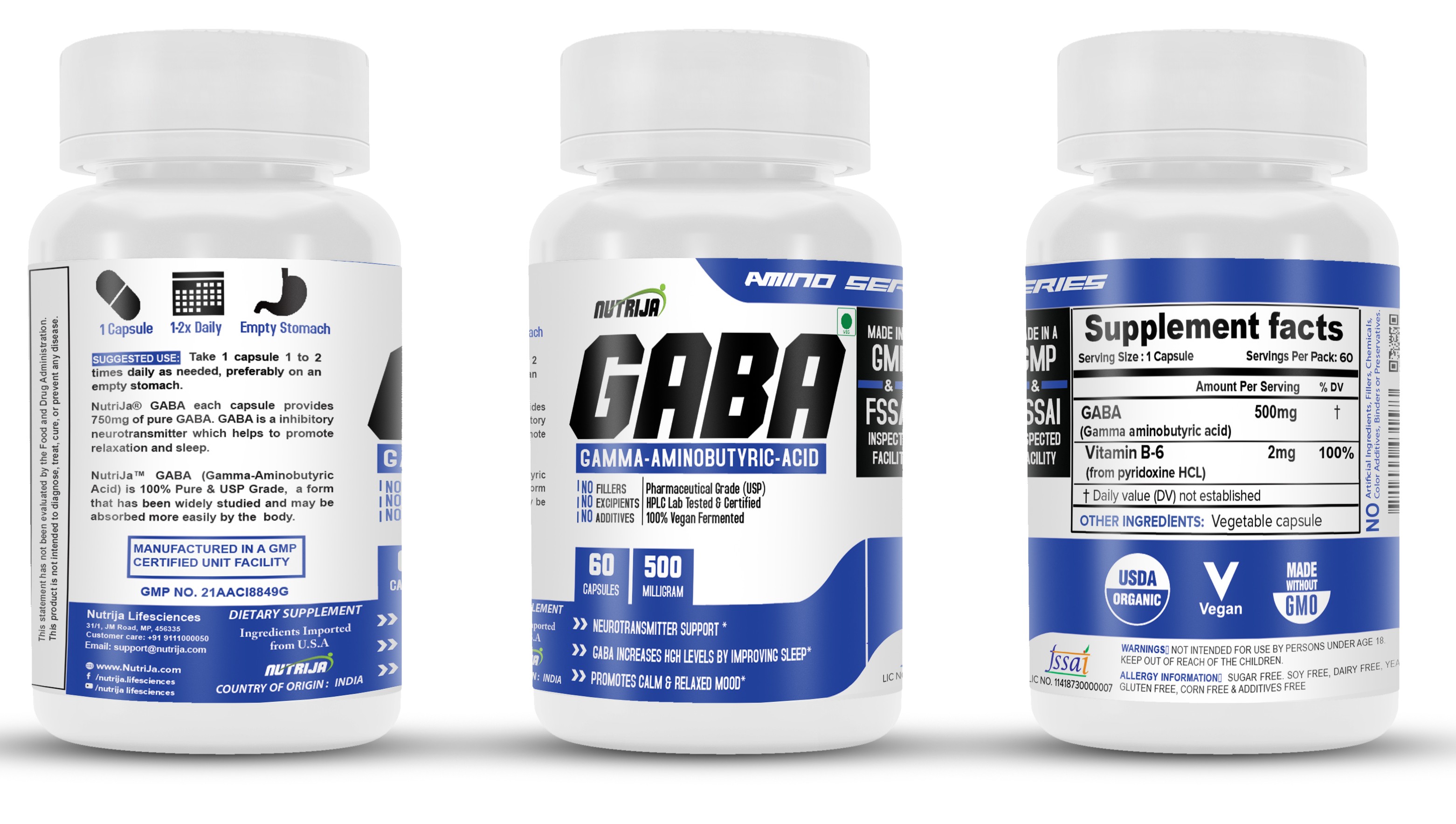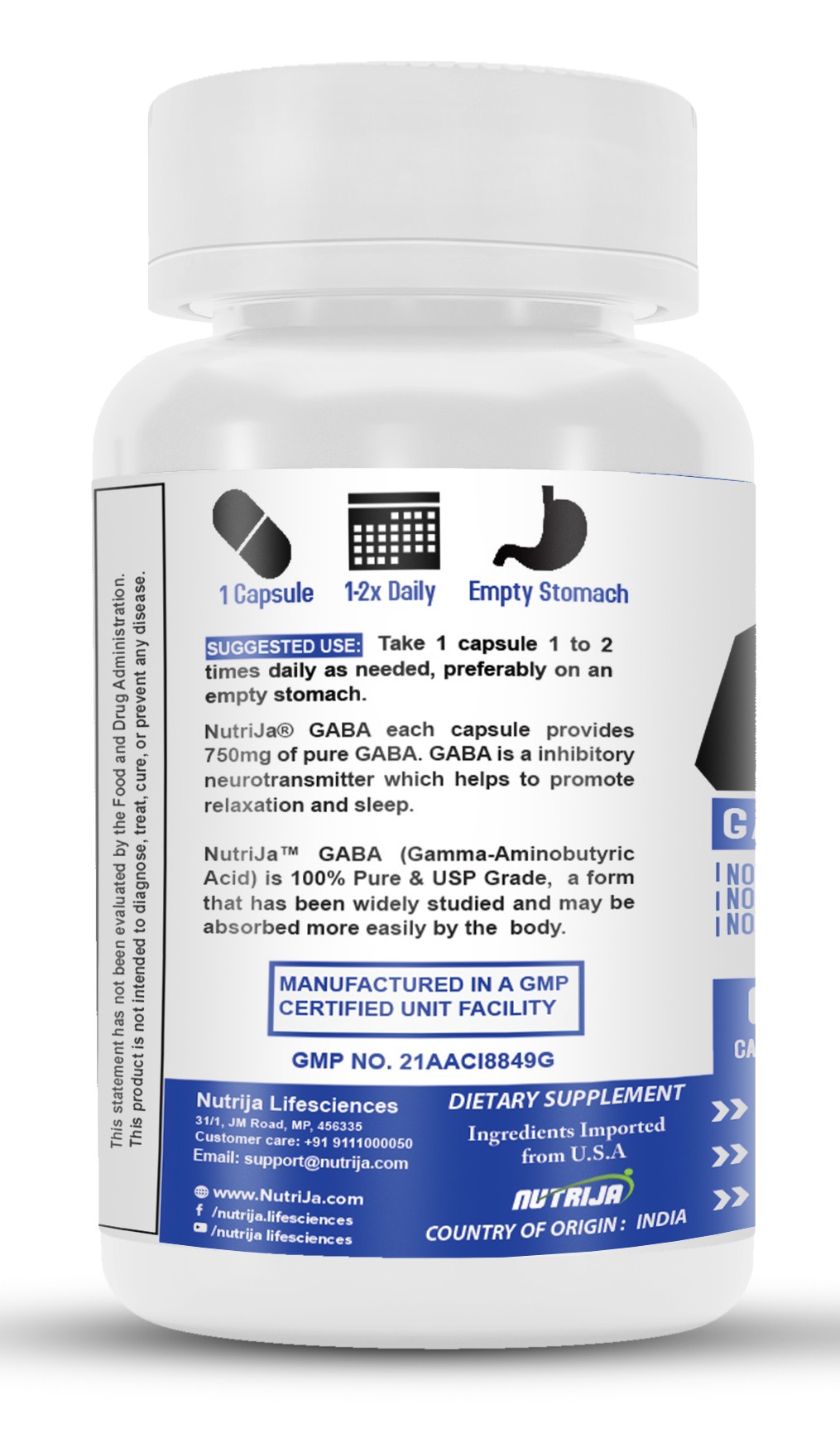 NUTRIJA® GABA (Gama-Aminobutyric acid) 100% Pure & USP Grade a form that has been widely studied and may be absorbed more easily by the body. GABA is manufactured in GMP certified facility in its purest form and derived from vegetarian source.