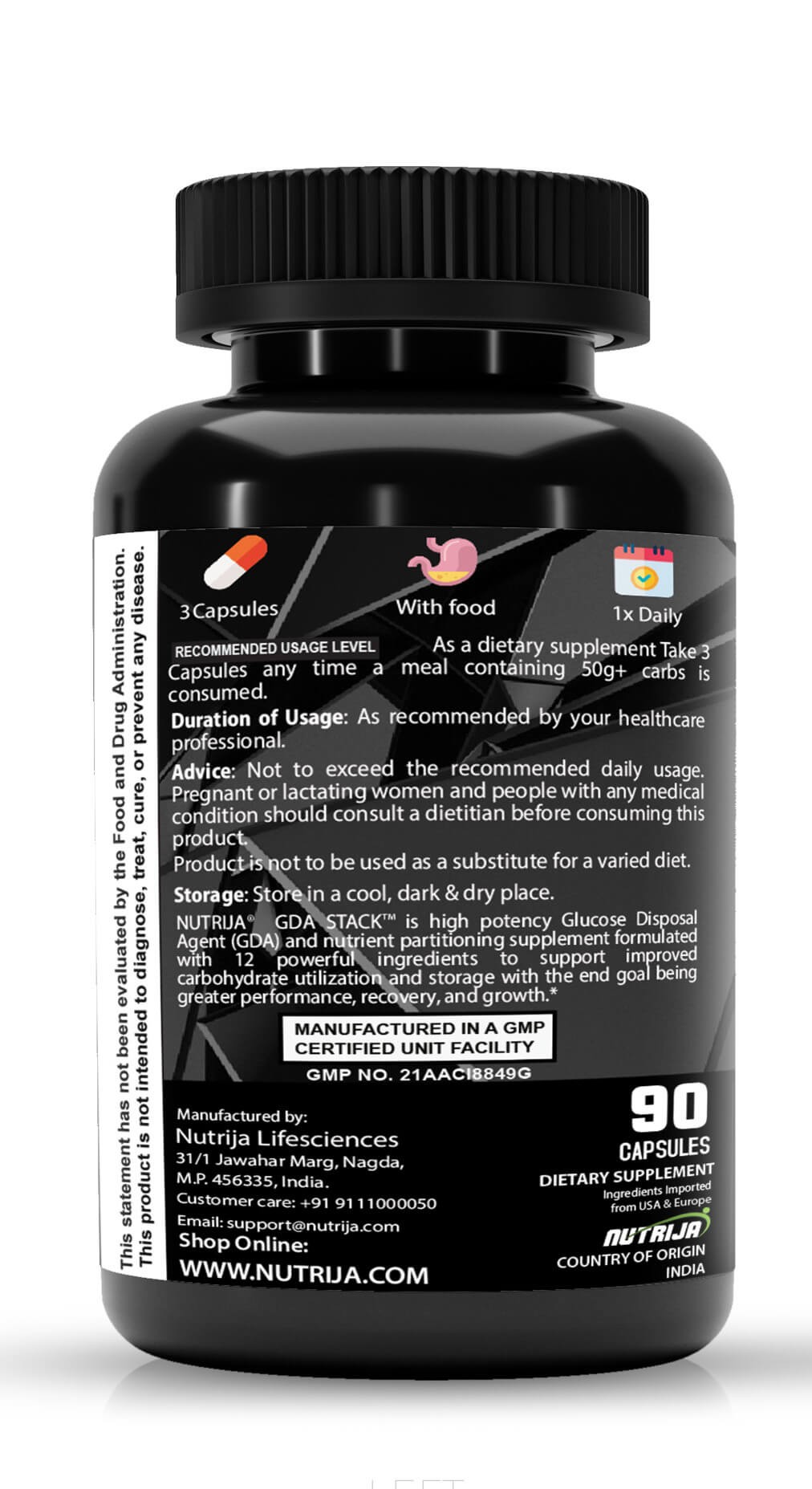 - NutriJa® GDA STACK™ combines 12 innovative Glucose Disposal Agent (GDA) ingredients which aims to improve muscle insulin sensitivity and optimise nutrient handling leading to more amino acids and glycogen being directed to muscle cells. By better harnessing the power of insulin you not only effect greater gains in muscle recovery and muscle fullness but also a reduction in bodyfat. As such, GDA STACK™ is a supplement which stands out as one of a rare type which is equally effective regardless of if your primary goal is to build muscle and strength or if it is to boost fat loss while retaining the maximum amount of muscle.