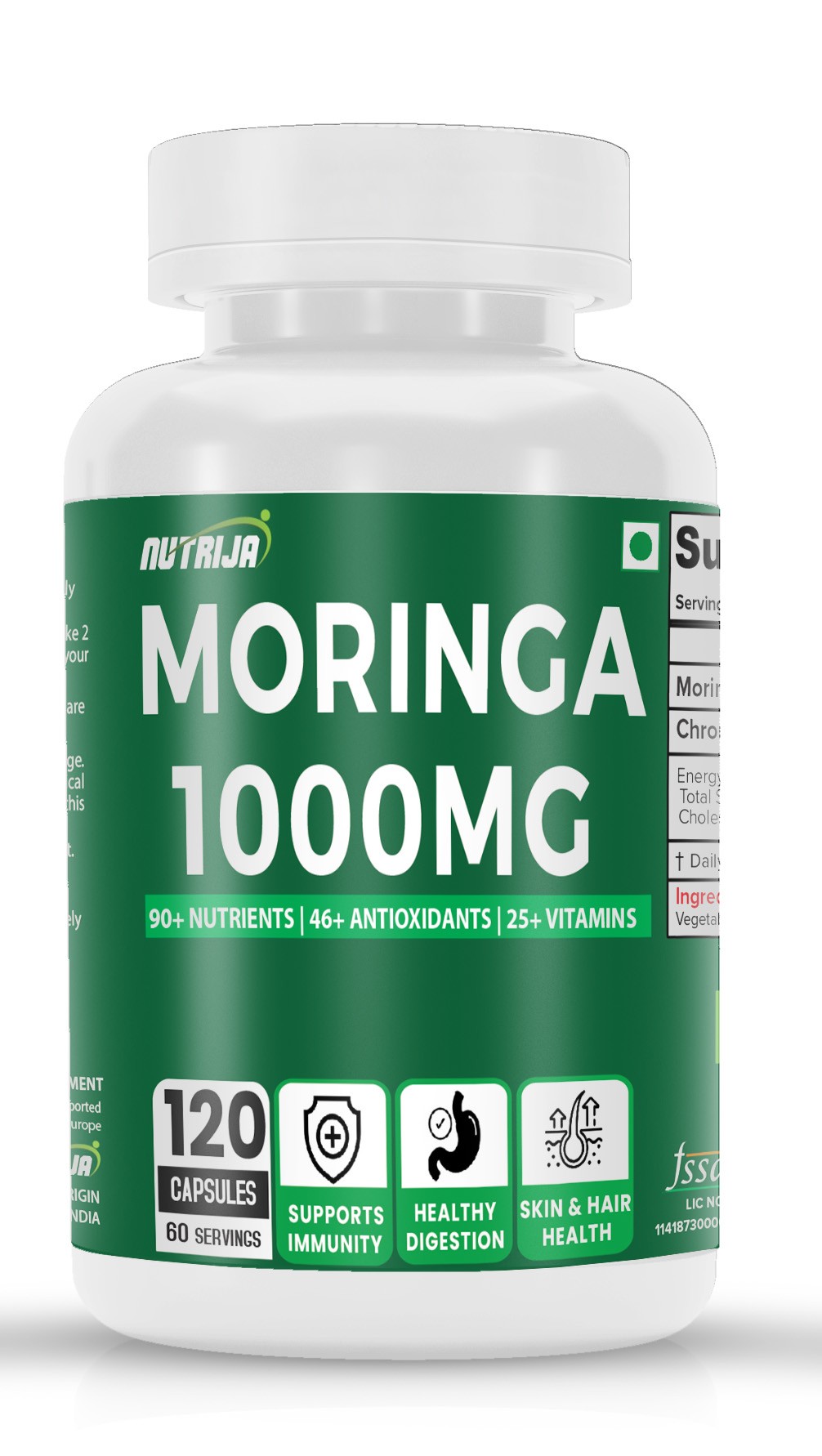 NUTRIJA® Moringa Capsules deliver 1000mg of pure Moringa in every serving. It helps to strengthen immunity, improve energy levels & reduce oxidative stress.