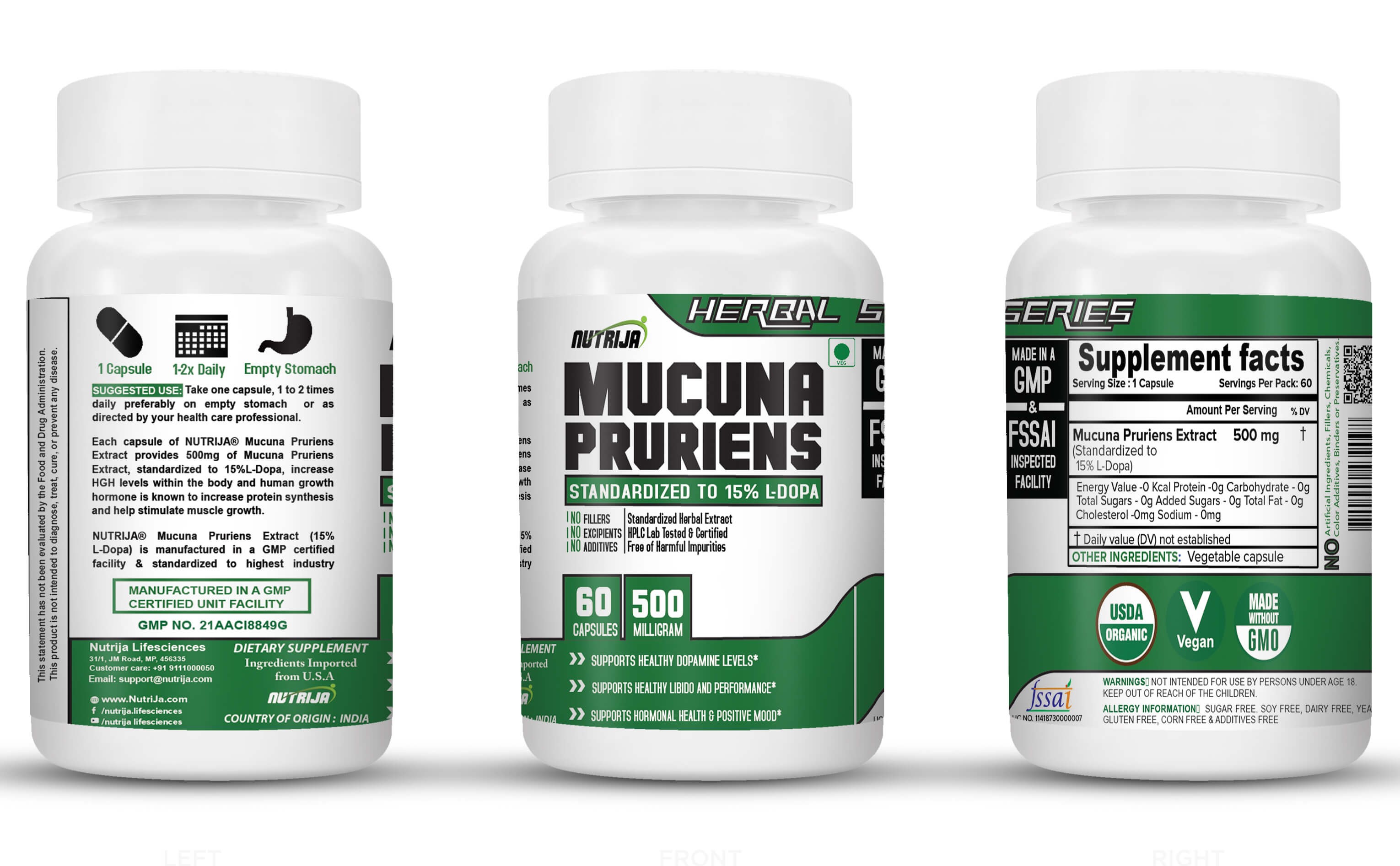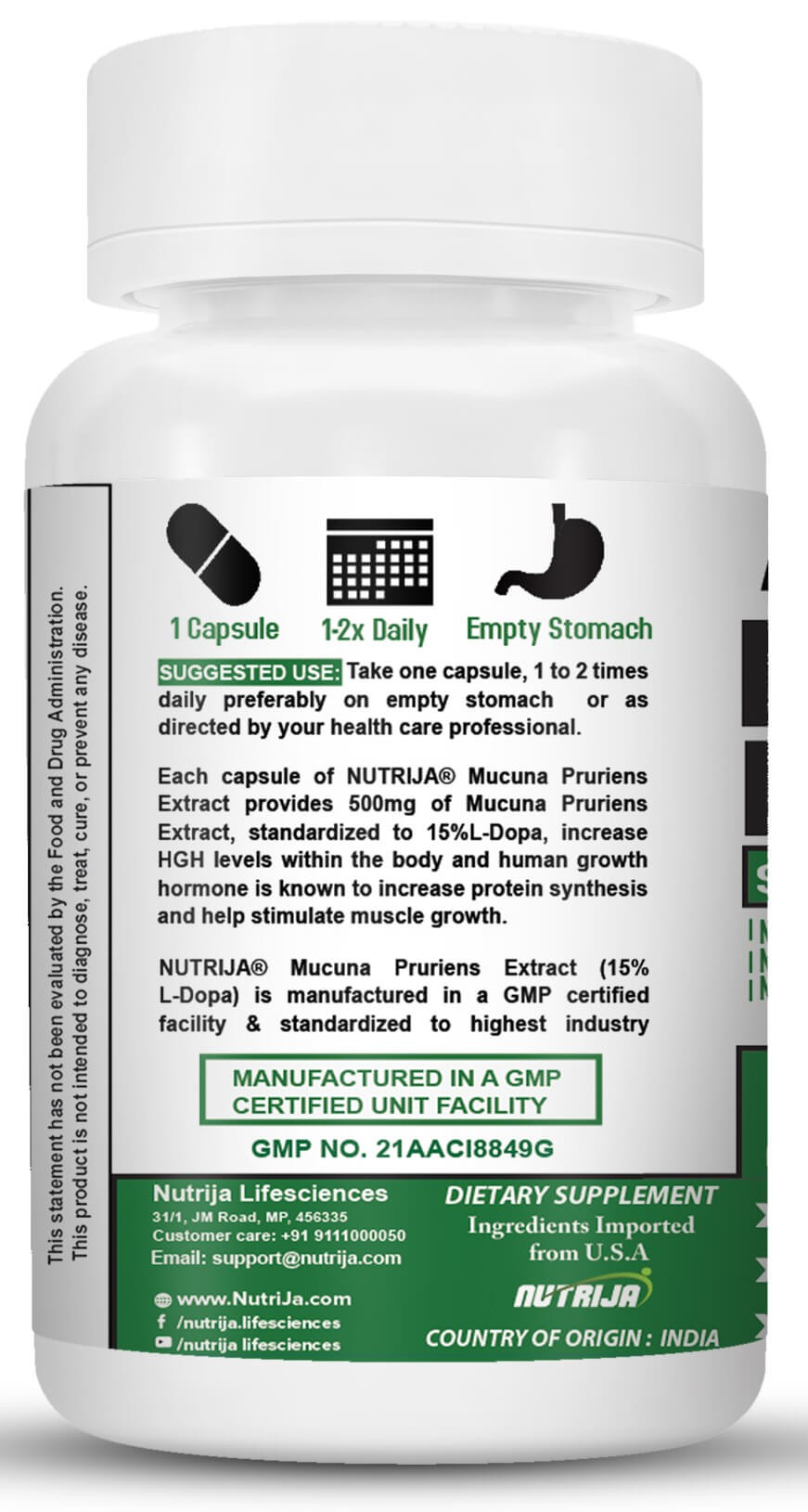- Each capsule provides 500mg of Mucuna Pruriens Extract, Standardized to 15%L-Dopa