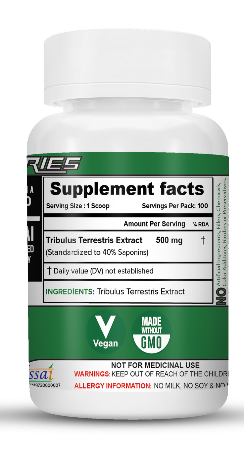 | Ingredients | Tribulus Terrestris Extract - 80:1 Extract ratio (Standardized to 50% Saponins) |